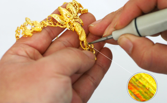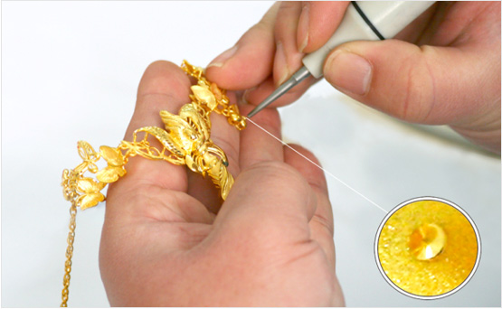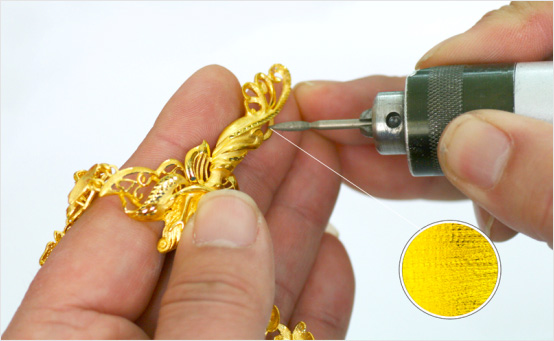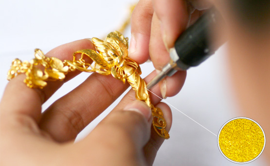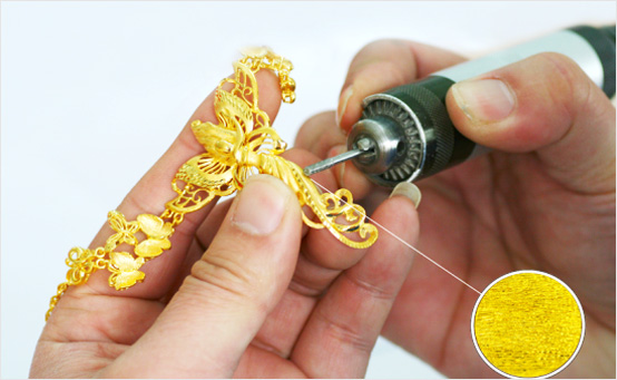 一件好的首飾產品需要運用多種首飾制作工藝,包括噴砂、釘砂、拉砂、飄砂、拉絲、車花等工藝,這一環節相當于對產品進行化妝,最終的產品效果全靠這些工藝來展現。